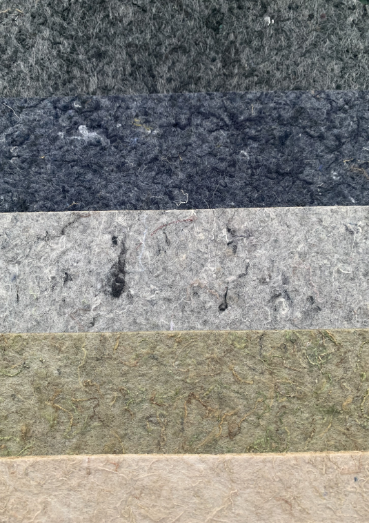 FELT made from recycled textile consist of several different materials suchas cotton, wool, flax, polyster and nylon.