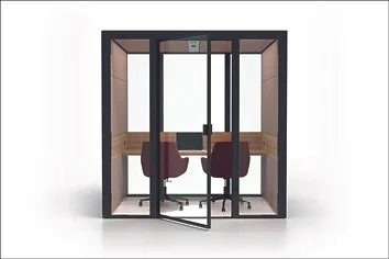 Spanning the width of the Pod, the bridge table creates an open, collaborative setting, ideal for group work and video calls.