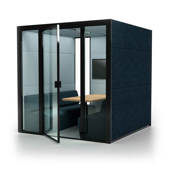 Equipped with standard and optional power and connectivity features including HDMI, USB, and DATA ports the pod supports seamless interaction with external devices. The transparent rear glass maintains visual openness, while layered acoustic panels ensure speech privacy.