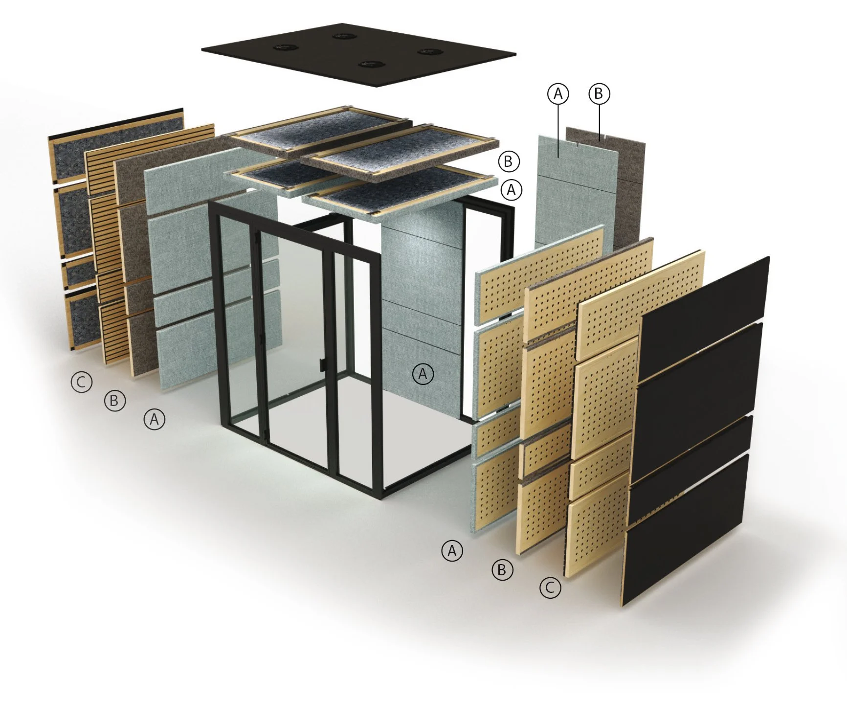 For each (removable) panel at the outside and inside of the meeting pods, a separate material, texture or color can be selected and even replaced for another new colorful texture in the future.